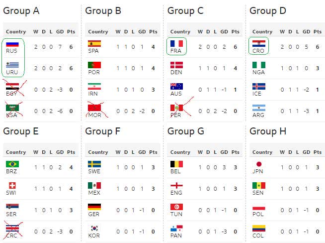 This is what the eight groups look like at the moment, with teams circled in green having already qualified for the R16 and those with red crosses already being dead in the water (albeit with a chance to play spoiler in the third round-robin game).